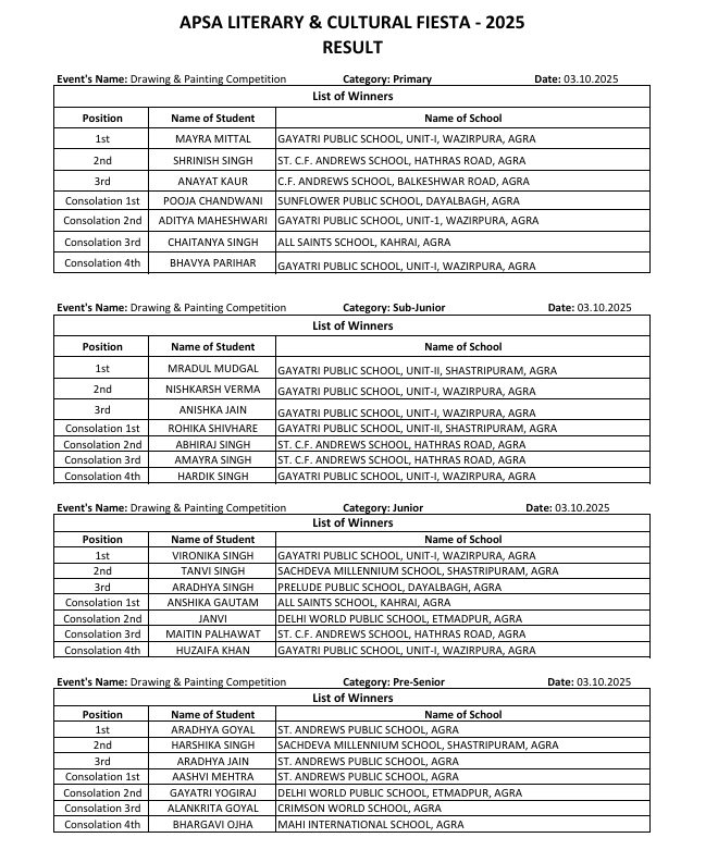Agra News Today आगरा में अप्सा (APSA) के साहित्यिक एवं सांस्कृतिक फिएस्टा 2025 का शानदार शुभारंभ 3 अक्टूबर को कर्नल ब्राइटलेंड पब्लिक स्कूल में हुआ। उद्घाटन समारोह में रंगारंग प्रस्तुतियों और ड्रॉइंग-पेंटिंग प्रतियोगिता ने माहौल को जीवंत बना दिया।