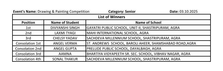 ड्रॉइंग और पेंटिंग प्रतियोगिता से फिएस्टा की औपचारिक शुरुआत हुई। इसमें कनिष्ठ, उप-कनिष्ठ, वरिष्ठ और उप-वरिष्ठ वर्गों के छात्रों ने उत्साहपूर्वक भाग लिया। निर्णायक मंडल में डॉ. मनोज कुमार, डॉ. आभा, डॉ. रेखा कक्कड़, श्री देवेंद्र कुमार सिंह, डॉ. शार्दुल मिश्रा और श्रीमती ललिता कुंजरु शामिल रहे।
